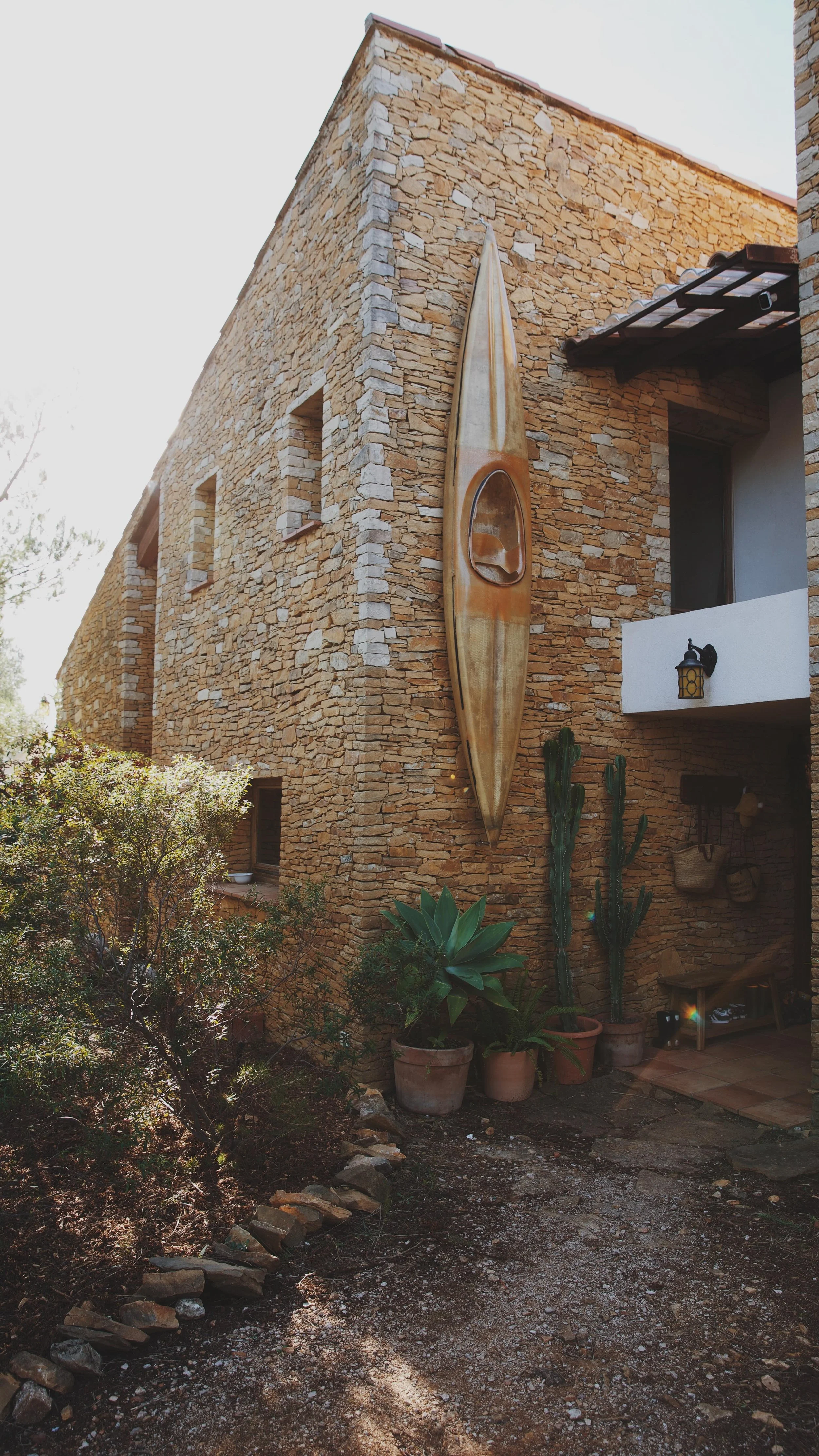 Entourée d’une végétation généreuse et construite en pierres sèches, la maison arbore un ton ocre naturel qui nous a évoqué dès le premier instant notre voyage à Sedona, une ville située dans le désert de l’Arizona aux États-Unis — une source d’inspiration qui lui a donné son nom actuel : la Villa Sedona.